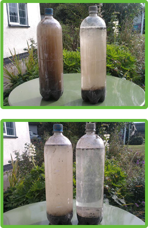 A simple demonstration of increased soil flocculation when applying "UltraSoil Penetrator". The bottle on the right has 3ml of Penetrator, the bottle on left has none. The first picture shows flocculation after 30 seconds and the second picture after 30 minutes.